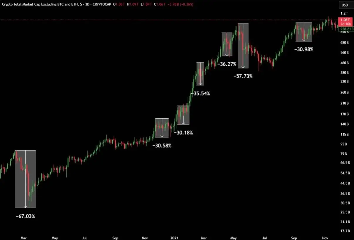 В марте 2020 года в результате события «черный лебедь», вызванного пандемией, рынки просели почти на 70%. В мае 2021 года падение превысило 50%. В течение последнего цикла бычьего рынка произошло как минимум пять других обвалов альткоинов на 30–40%.
