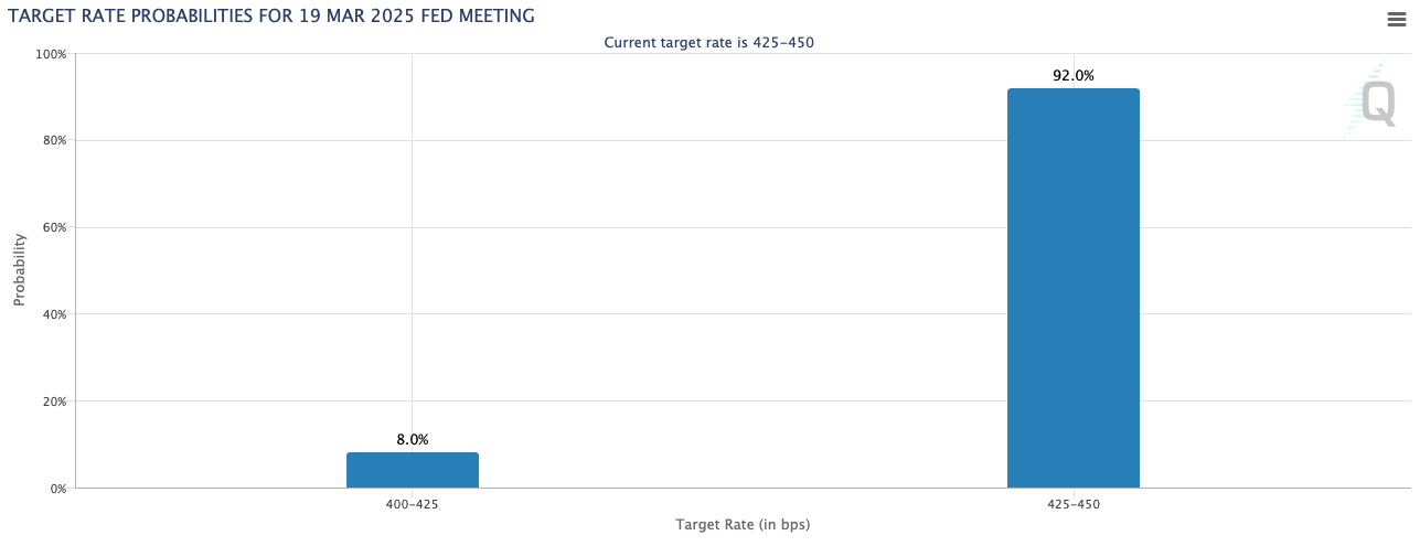 По информации портала FedWatch, вероятность снижения базовой кредитной ставки на следующем заседании ФРС в марте составляет всего 8 процентов. С вероятностью в 92 процента на данный момент Федеральная резервная система оставит ситуацию без изменений.