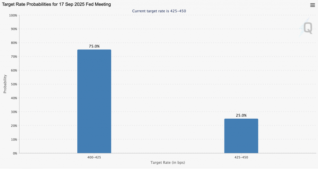 Kobeissi предположил, что ФРС снизит ставки на 25 базисных пунктов — такую же оценку дают рыночные ожидания согласно инструменту FedWatch Tool от Чикагской товарной биржи. Ранее сохранялась неопределенность относительно сентябрьских решений, поскольку Пауэлл придерживался жесткой позиции на фоне растущих инфляционных сигналов и неопределенности вокруг торговых тарифов США.