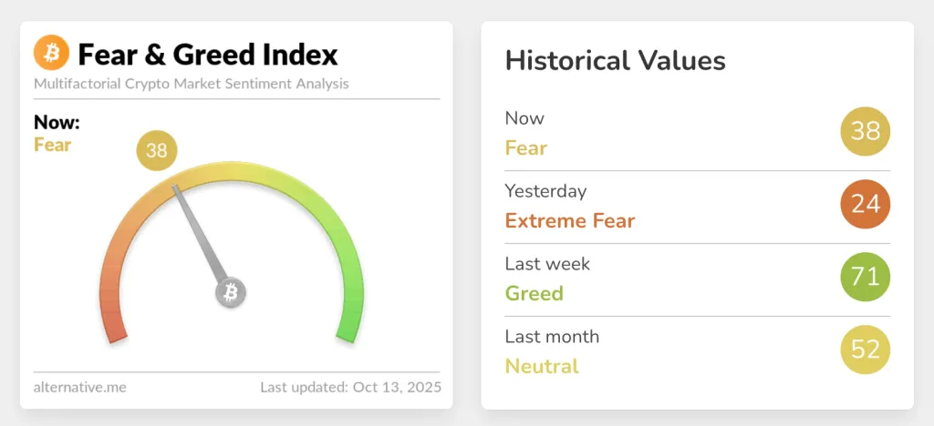 Криптовалютный индекс страха и жадности упал до 24 пунктов, сигнализировав об «экстремальном страхе» на рынке. На момент написания показатель восстановился до 38.