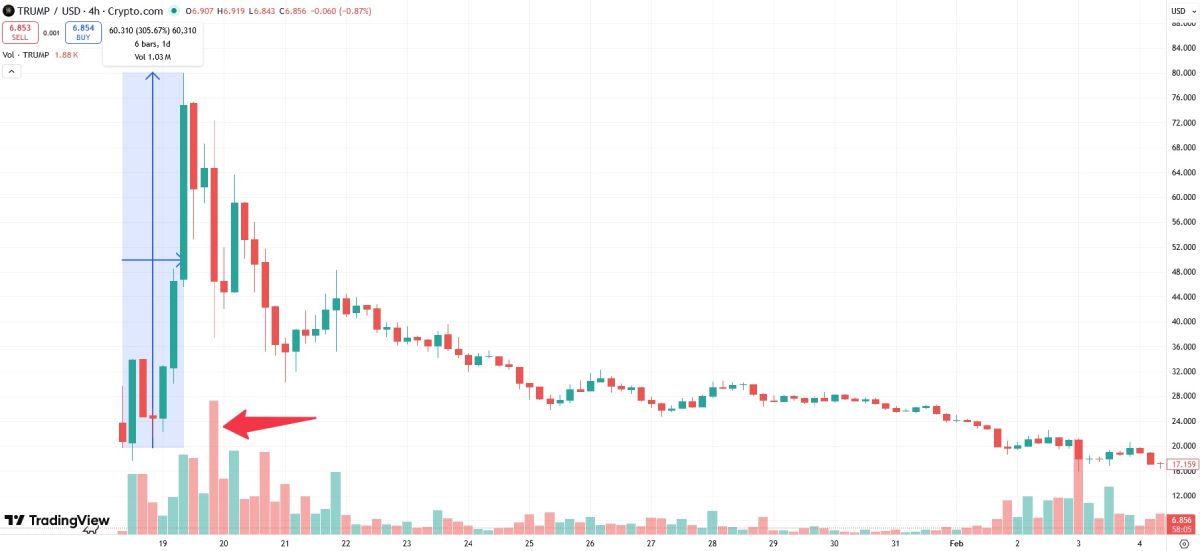 Главная проблема заключается в том, что памп и дамп обычно проворачивают спустя несколько часов после листинга цифровых активов на централизованных биржах. Приведём в качестве примера мемкоин президента США Дональда Трампа Official Trump (TRUPM), покупатели которого пали жертвами пампа и дампа. Токены были добавлены на Crypto.com и другие платформы 18 января, за сутки они подорожали на 306% и затем так же быстро подешевели. В связи с этим прибыль заработали ранние инвесторы, успевшие продать мемкоины до появления огромной красной свечи, указывающей на большое количество проданных монет, или сразу после её возникновения. Те, кто понадеялись на возобновление восходящего движения, остались у разбитого корыта.