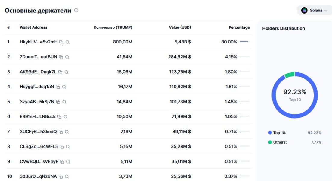Статистические показатели о виртуальной валюте можно найти, например, на сайте Coinmarketcap. Этот ресурс публикует данные об уровне капитализации монеты, объёме торгов, количестве владельцев цифровых активов, их распределении и многом другом. Одним из главных красных флагов служит излишняя концентрированность монет. Например, 80% мемкоинов TRUMP хранятся в одном криптокошельке, что служит тревожным сигналом.