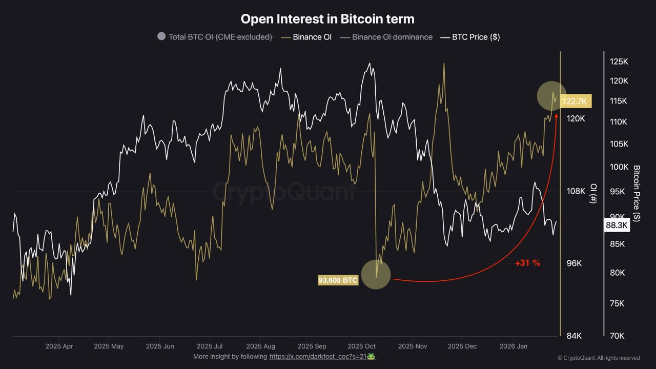 Также они добавили, что, несмотря на недавнее падение, открытый интерес на Binance продолжает расти. Сейчас он составляет более 123 000 $BTC, превысив уровни, которые были зафиксированы до 10 октября (тогда он опускался до 93 600 $BTC). Этот рост более чем на 31% указывает на возвращение аппетита к риску среди участников рынка, подчеркнули в CryptoQuant.