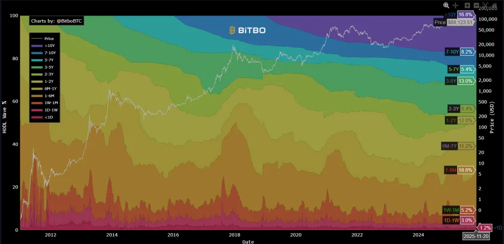 Согласно BitBo, 32,4% всего предложения биткоина остается без движения более пяти лет. 16,8% монет не перемещались свыше 10 лет. Неизвестно, какая часть этих средств утеряна навсегда, а какая находится в долгосрочном хранении.