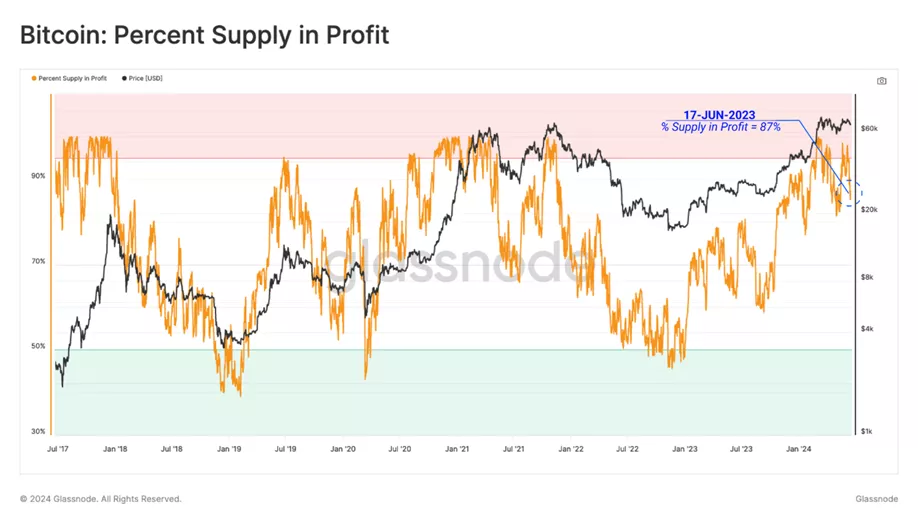 Специалисты отметили, что инвесторы остаются в целом в выгодном положении, поскольку более 87% удерживаемых биткоинов прибыльны.