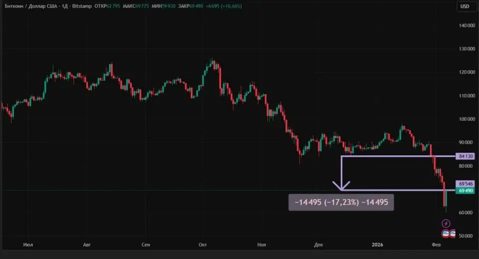 Биткоин с 30 января по 6 февраля 2026 года потерял 17,23% своей стоимости. $BTC опустился ниже $70 000 впервые с ноября 2024 года. На недельном минимуме крупнейшая по капитализации криптовалюта и вовсе торговалась ниже $60 000.