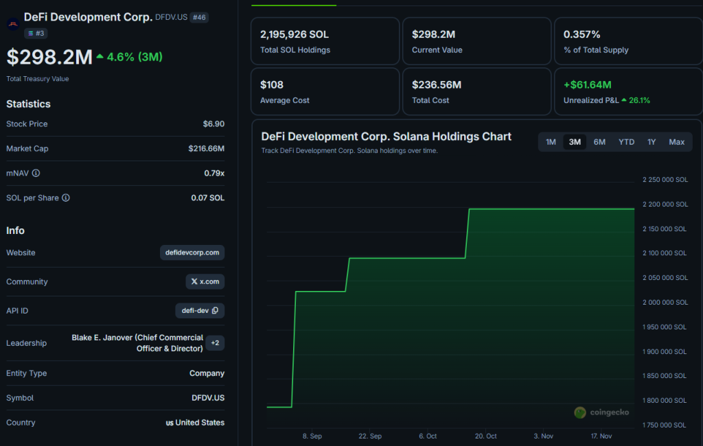 На балансе DFDV находится 2,19 млн SOL (~$298 млн).