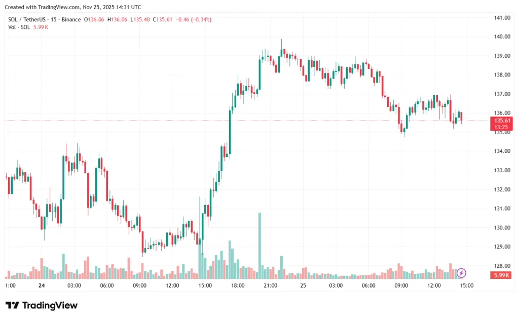 За последний месяц цена SOL упала на 31,7%, до $135,61.