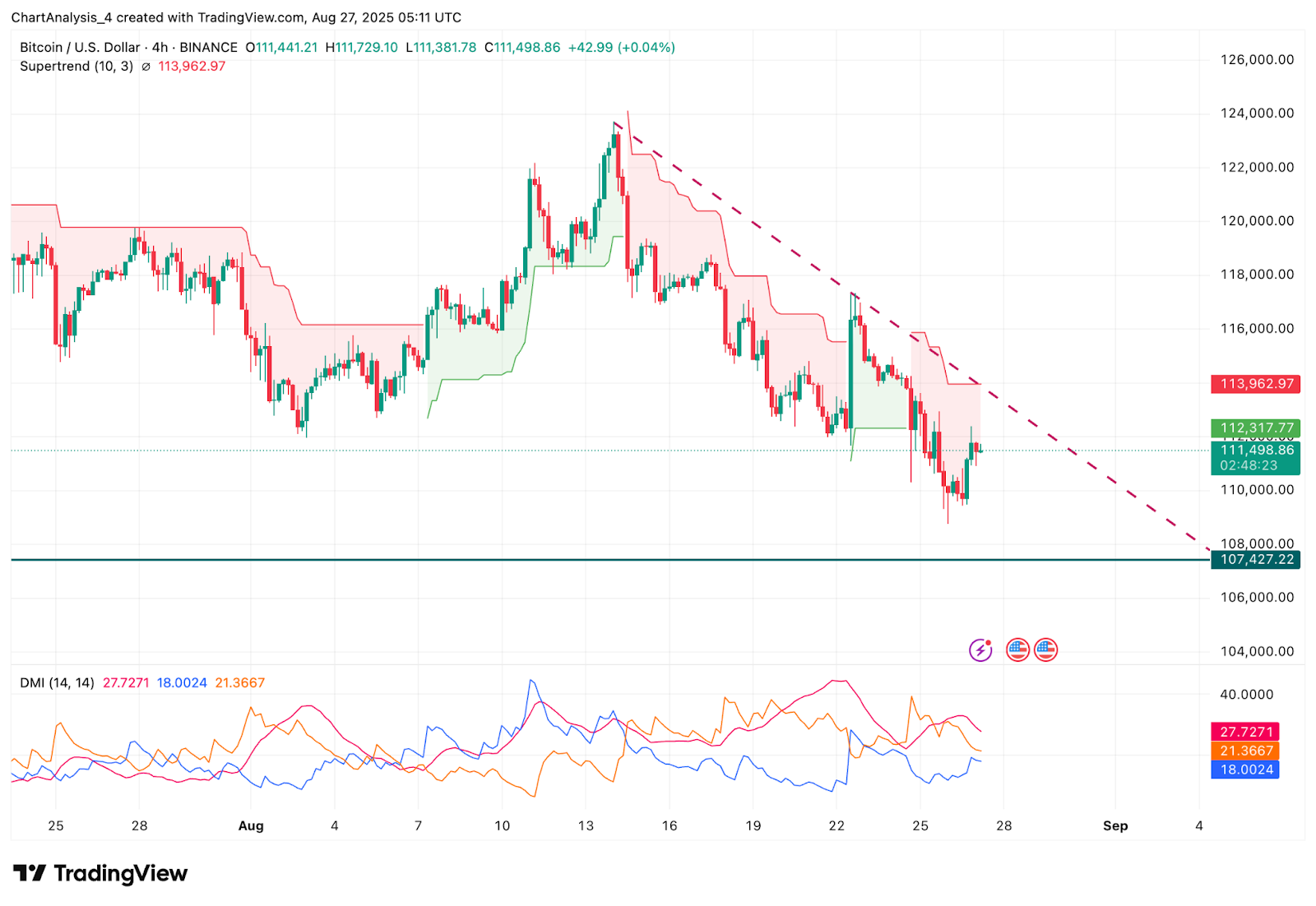 Однако импульс ослаб. RSI находится на уровне 41,8, что отражает медвежий настрой после падения с июльских максимумов. MACD остаётся ниже сигнальной линии, указывая на ослабление восходящего давления. На 4-часовом графике движение BTC ограничено нисходящей линией тренда в районе $113 900, а выше находится уровень сопротивления Supertrend.