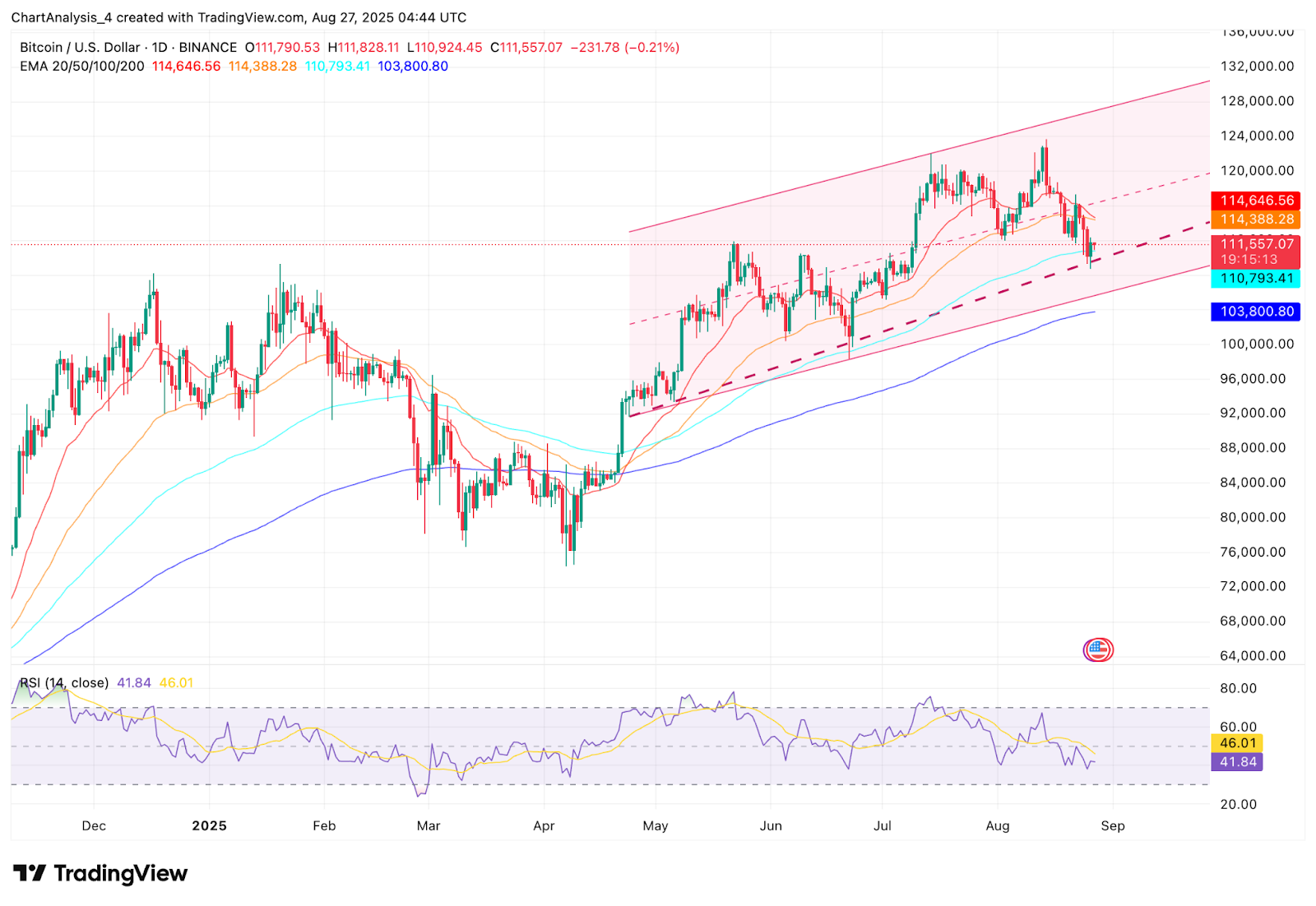 На дневном графике BTC удерживает нижнюю границу своего восходящего канала, зафиксированную в районе $110 800–111 000. Этот уровень также совпадает со 100-дневной экспоненциальной скользящей средней (EMA) на уровне $110 793, что даёт быкам техническую подушку безопасности.