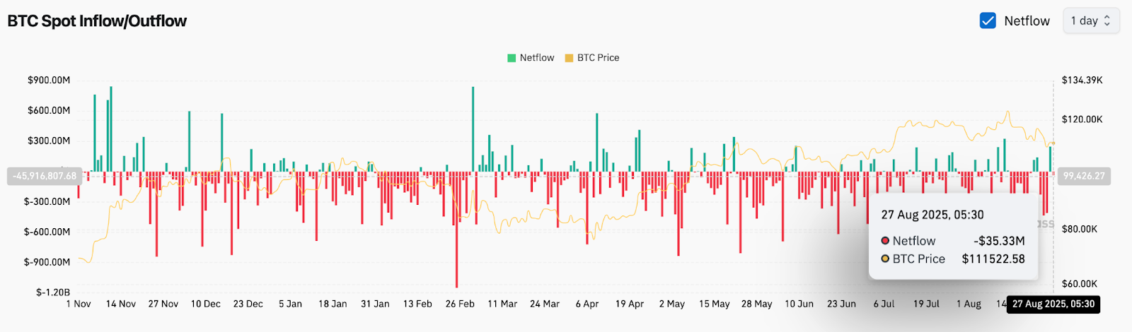 Биткоин торгуется около $111 500, немного снизившись после тестирования уровня $110 900 в среду. Последний откат отражает сочетание сезонной слабости и продолжающегося оттока средств из ETF, что заставляет трейдеров проявлять осторожность в преддверии сентября.