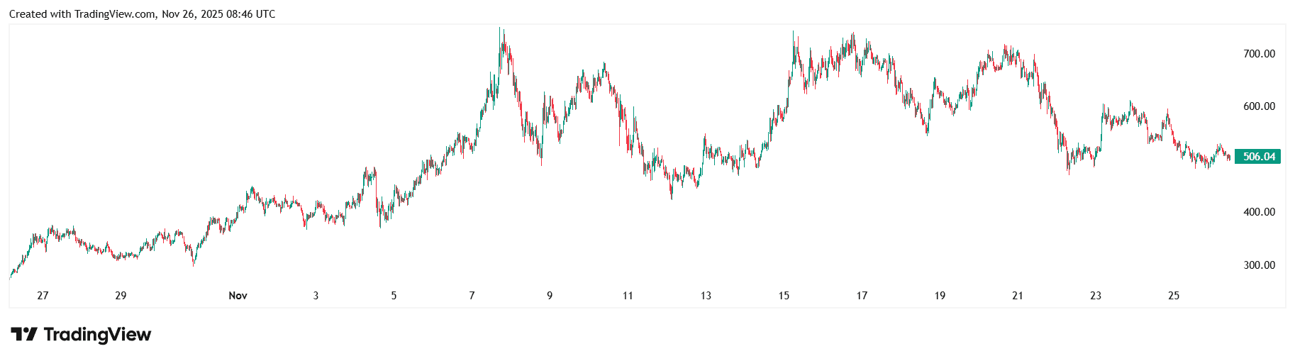В начале ноября 2025 года Zcash отметилась положительной динамикой, что позволило активу обновить многолетний максимум. В моменте актив пробил отметку в $743, но затем откатился. На месячном чарте позиция по-прежнему «в плюсе», на 55%.