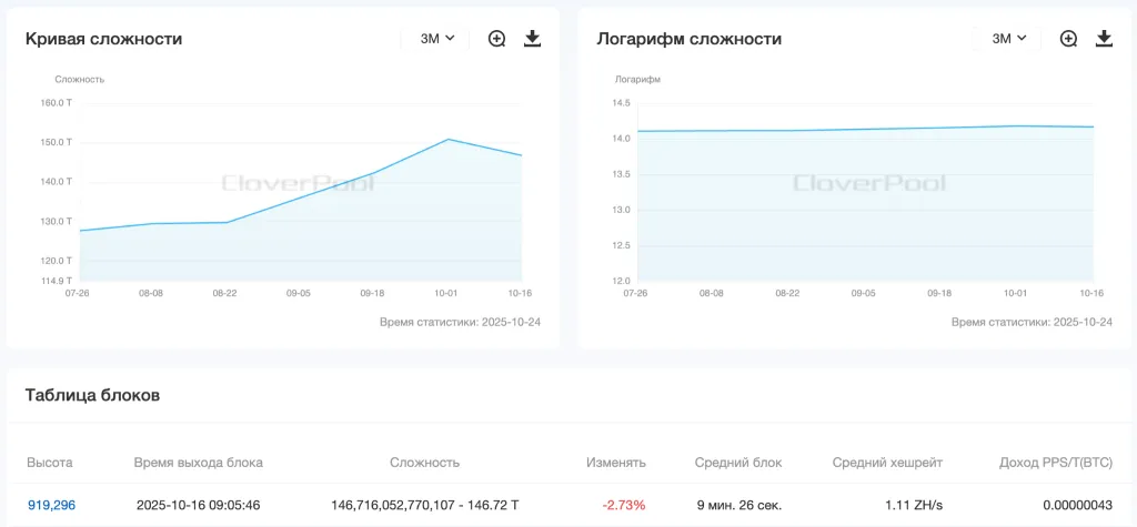 Ранее сложность майнинга цифрового золота достигла рекордных 150,8 Т. В ходе перерасчета 16 октября показатель скорректировался до 146,72 T. Текущий прогноз для метрики — рост на 6,8%, до 156,79 T.