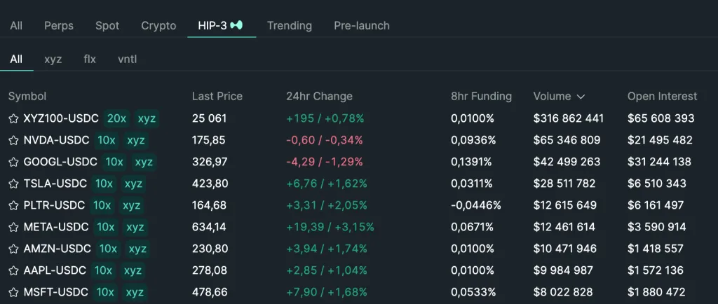 - xyz (trade.xyz от команды Hyperunit/Unit) — сфокусирован на основных фондовых индексах и акциях с высоким объемом торгов. Ключевой токен — XYZ100, который отслеживает топ-100 американских нефинансовых компаний с плечом до 20x. Представленные активы включают NVDA, GOOGL, TSLA, PLTR, META, AMZN, AAPL, MSFT и COIN. Механизм платформы использует ончейн-стакан заявок Hyperliquid, трейдеры работают через депозиты в USDC. Для стимулирования ликвидности применяется «режим роста», снижающий комиссии тейкеров на 90%.