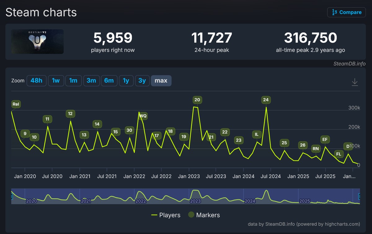 Молчание студии относительно судьбы обновления стало серьезной проблемой в коммуникации с сообществом – Bungie не комментировала ситуацию до последнего момента, несмотря на очевидный конфликт дат с релизом Marathon. Это усугубило и без того напряженную атмосферу вокруг игры, переживающей значительный спад популярности. Согласно данным SteamDB, текущее количество максимальных одновременных игроков в Destiny 2 составляет чуть более 11 000 человек – исторический минимум для шутера.