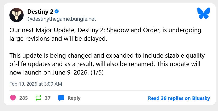 Bungie объяснила задержку необходимостью расширения контента и добавлением значительных улучшений качества жизни. Обновление теперь включит систему ранговой экипировки для всех рейдовых и подземельных активностей, событие Пантеон 2.0, характеристики пятого уровня для экзотической брони и ранее анонсированную систему улучшения оружейных уровней. До июня разработчики пообещали регулярные исправления ошибок, модификаторы порталов, событие "Игры стражей" в марте и более частые появления "Железного знамени" с апреля.
