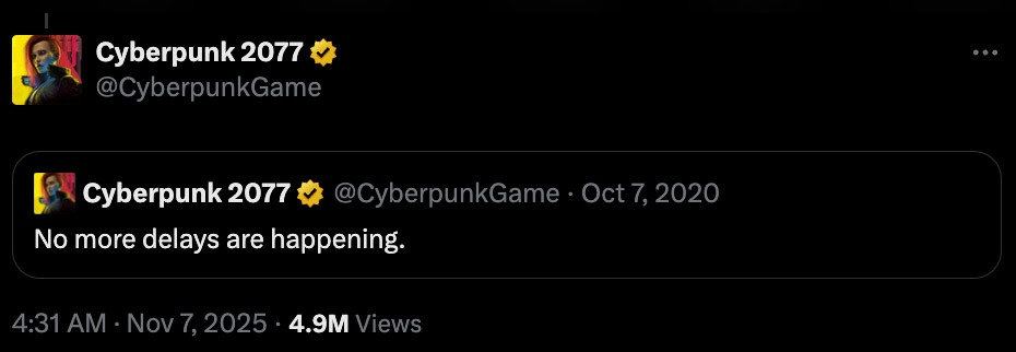 В ответ CD Projekt RED откопала пятилетней давности пост в соцсетях: "Больше никаких задержек", который студия опубликовала после последнего переноса Cyberpunk 2077. Пост без слов стал мрачным напоминанием о том, что происходит, когда игру выпускают неготовой. Cyberpunk 2077 стала одним из самых громких и печально известных провальных релизов поколения из-за массы багов и технических проблем.