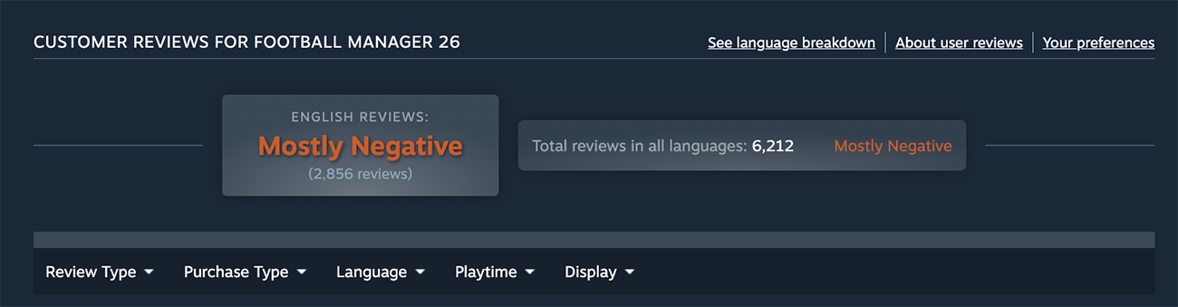 Football Manager 26 стала одной из худших игр в истории Steam за сутки после релиза