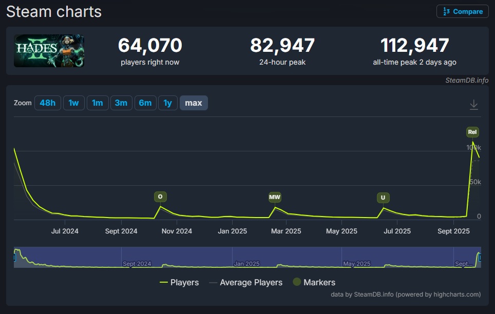 Hades 2 достигла впечатляющих результатов в Steam после полноценного запуска, превзойдя показатели раннего доступа. Согласно данным SteamDB, сиквел популярного рогалика установил рекорд по пиковому онлайну, достигнув отметки в 112 947 одновременных игроков за выходные. Этот показатель превышает предыдущий максимум, зафиксированный в мае прошлого года, когда игра привлекла более 103 000 пользователей одновременно.