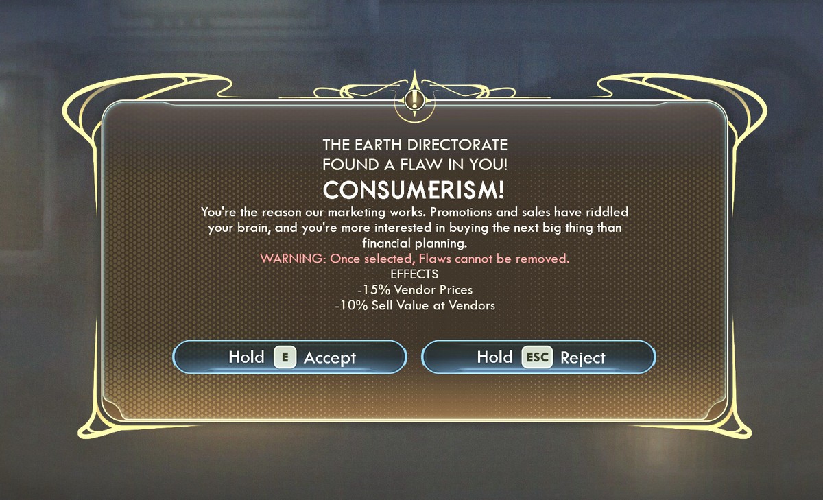 Но это ещё не всё. К уведомлению прилагается настоящий "Изъян" – и как предупреждают разработчики, "После выбора Изъяны нельзя удалить". Эффект сочетает баф и дебаф одновременно: скидка 15% на все цены у торговцев, но также снижение стоимости продажи на 10%.