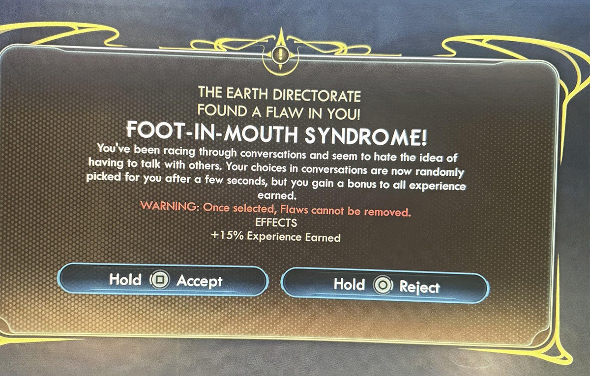 Вы проносились через разговоры и, кажется, ненавидите саму идею общения с другими. Теперь ваши выборы в диалогах делаются случайным образом через несколько секунд, но вы получаете бонус ко всему получаемому опыту.