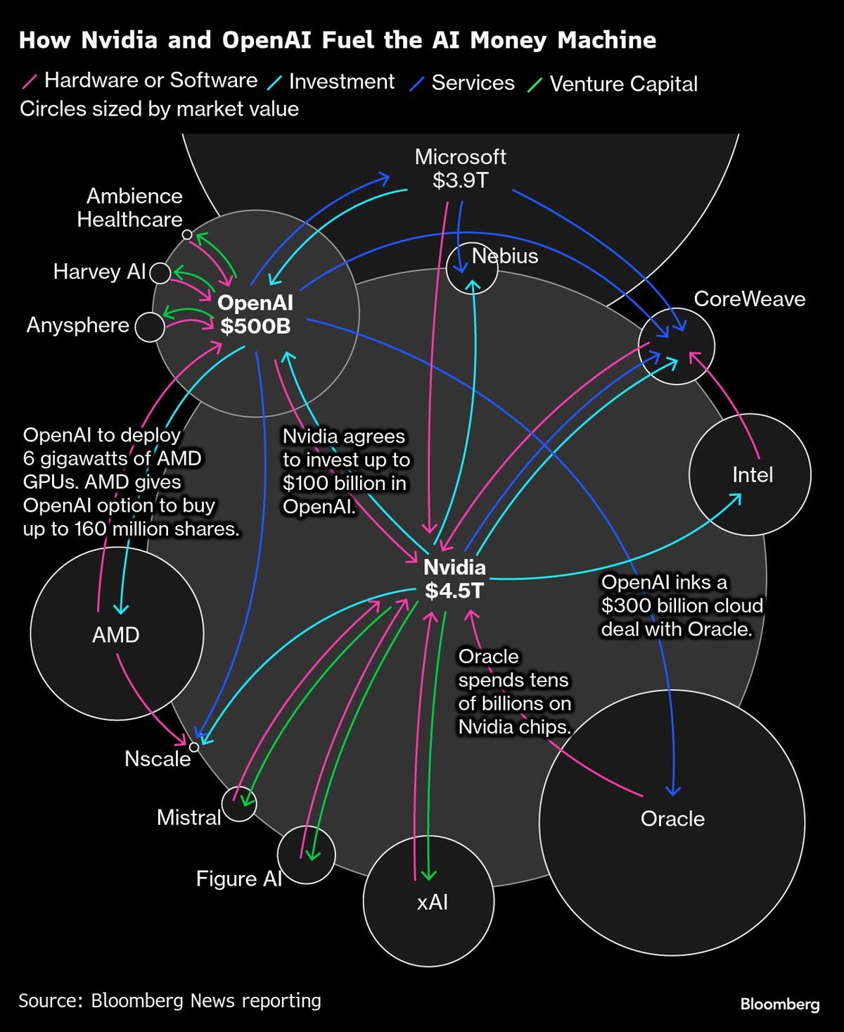 Третье фото в посте Бьюрри – диаграмма Bloomberg, показывающая циркулярные сделки между топовыми ИИ-компаниями с Nvidia в центре. Опасения по поводу круговых инвестиций усиливаются в последние месяцы, особенно на фоне постоянных объявлений Nvidia и OpenAI о сделках на миллиарды долларов.