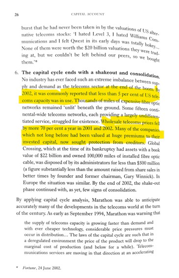 В финальном посте Бьюрри опубликовал страницу из книги "Capital Account" с выделенными фрагментами о крахе телекоммуникационного сектора после лопнувшего дот-ком пузыря: