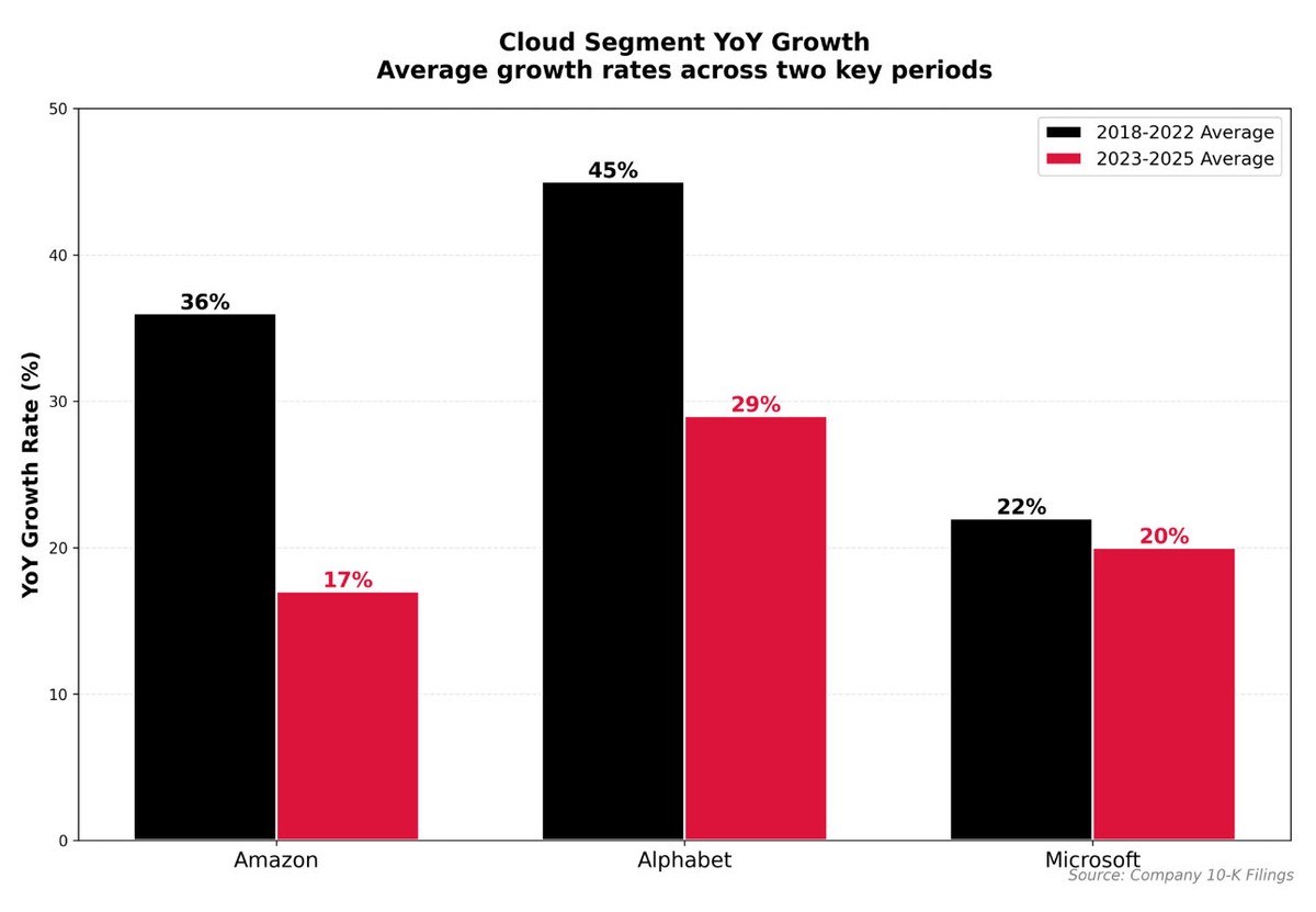 В понедельник Бьюрри опубликовал ещё четыре изображения без комментариев. На одном из них показано снижение годового роста облачных сегментов Amazon, Alphabet и Microsoft в 2023-2025 годах по сравнению с 2018-2022 годами. Все три компании доминируют на рынке облачных услуг.