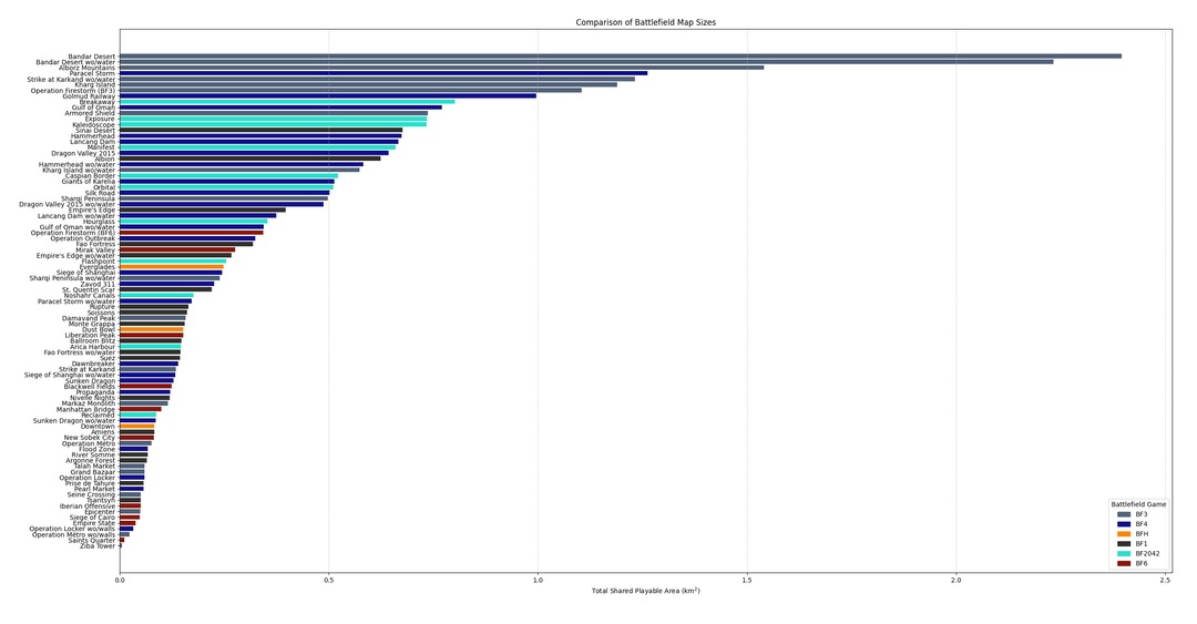 Пользователь ClaraTheRed опубликовал результаты исследования на Reddit, включив визуализацию всех 87 карт из различных Battlefield, а также графики с разбивкой по общей и игровой площади. Подавляющее большинство карт Battlefield 6 находятся в нижней части рейтинга по размеру.