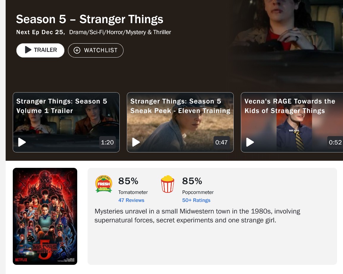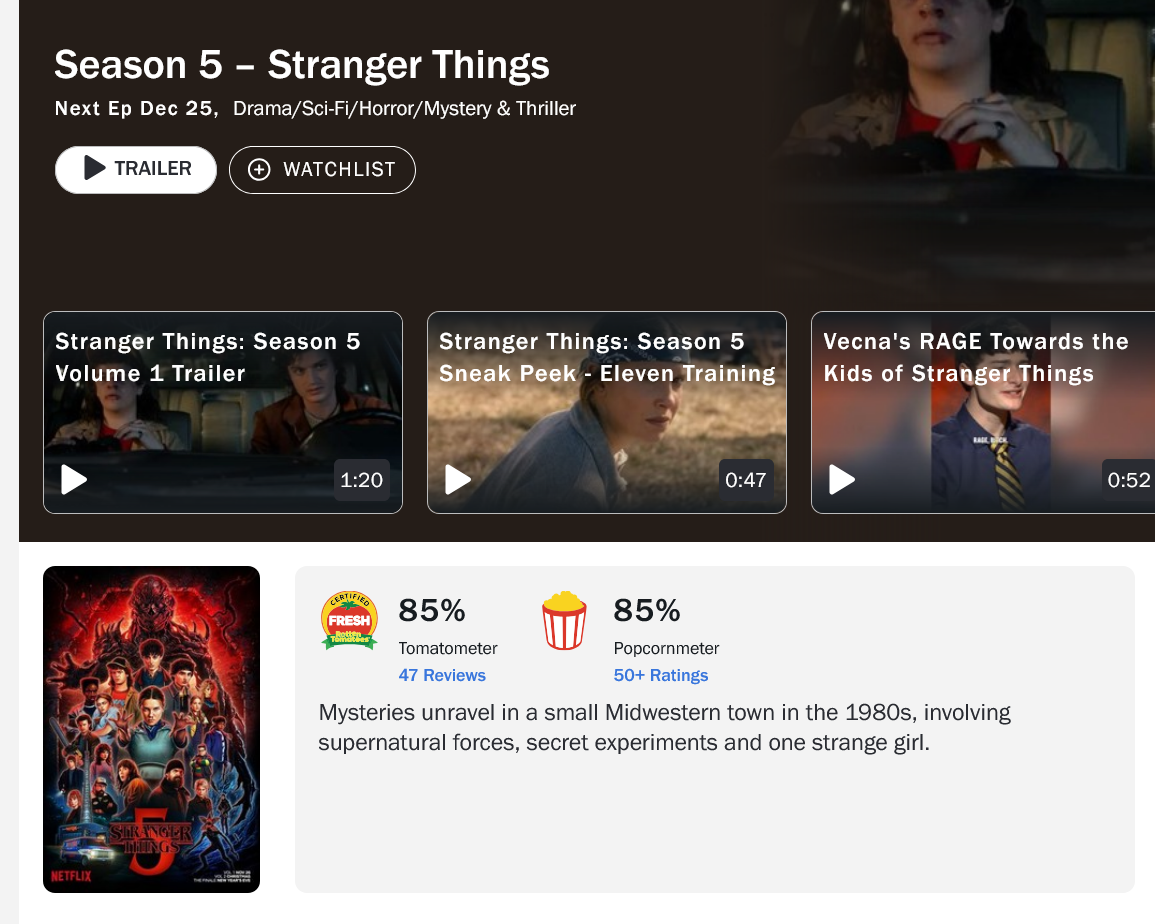 Первые четыре эпизода пятого и заключительного сезона "Очень странных дел") Stranger Things) вышли на Netflix, и вместе с премьерой были опубликованы первые рецензии критиков. В целом профессиональные обозреватели оценили возвращение в Хокинс положительно – на Rotten Tomatoes у первой части сезона 85% положительных отзывов на основе 47 рецензий со статусом "Свежо".