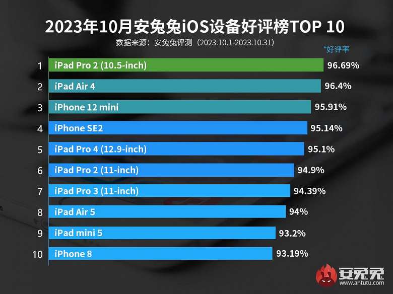 Первое место принадлежит 10,5-дюймовому iPad Pro 2 с 96,69% положительных отзывов. На втором месте расположился планшет iPad Air 4 (96,4%), дебютировавший в сентябре 2020 года. Третье место принадлежит компактному iPhone 12 mini с 95,91%, дебютировавшему в также в 2020 году.