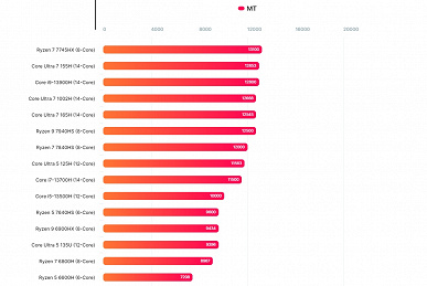В первом случае результат сравним с Core i5-13500H, а во втором новинка уже немного отстаёт от этого родственника. При этом, напомним, Core i5-13500H имеет четыре больших ядра, восемь малых и TDP 45 Вт против 15 Вт у новинки, так что результат Core Ultra 5 135U выглядит весьма обнадёживающим. К слову, примерно на том же уровне и шестиядерный Ryzen 5 7640HS.