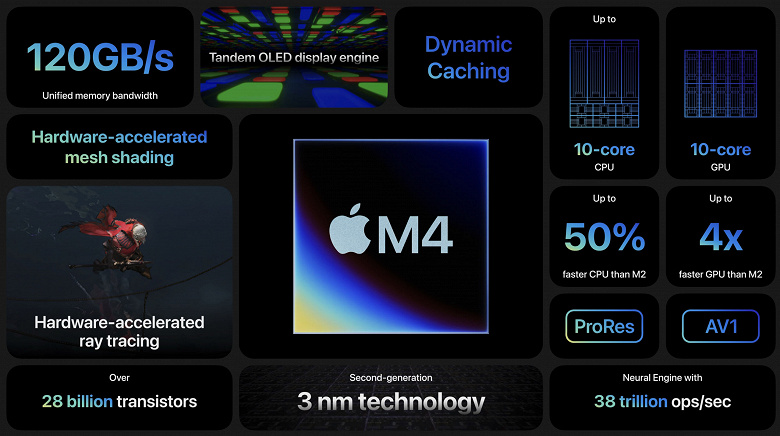 M4 также предлагает пропускную способность памяти в 120 ГБ/с, аппаратное ускорение трассировки лучей и технологию динамического кеширования. А ещё M4 впервые приносит на iPad аппаратное ускорение AV1.